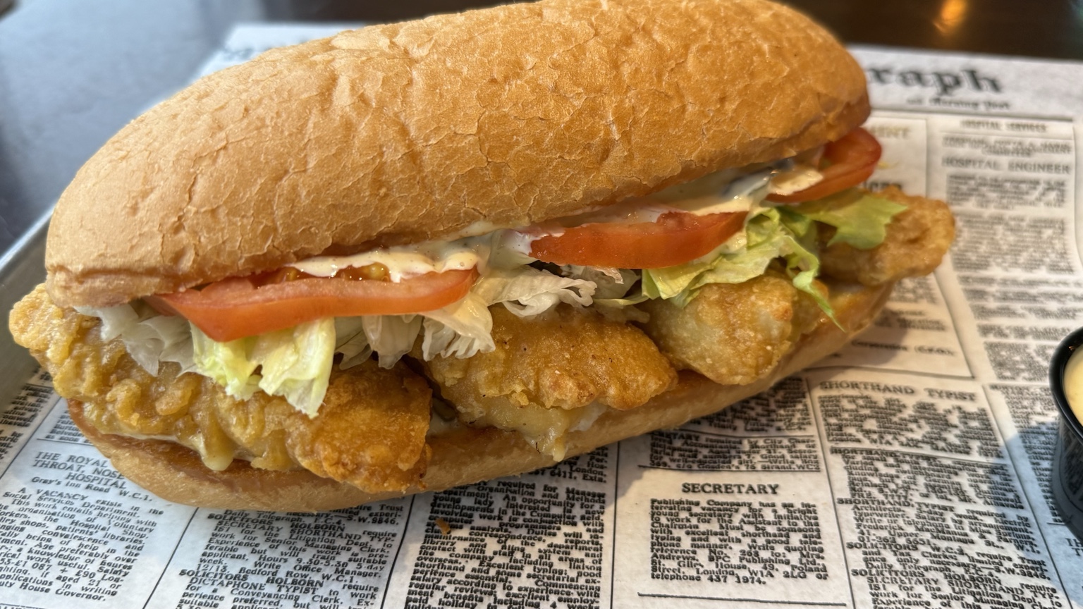Our Guinness Beer-Battered Fish Sandwich is back and better than ever — crispy, golden, and topped with our homemade tartar sauce, fresh lettuce, and tomato on a soft toasted French roll.