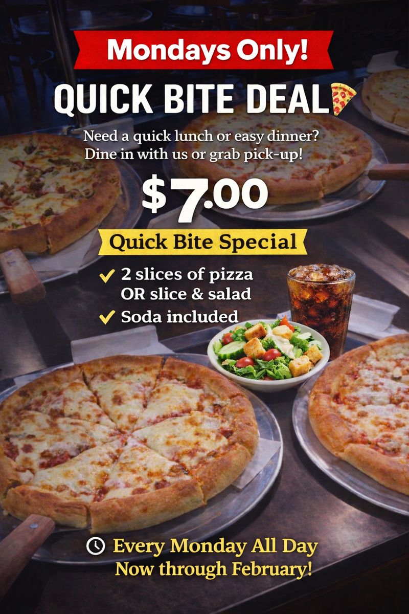 Most delicious pizza in Minnesota. I can't say enough about how much flavor is packed into just one slice. Lunch special 2 slices & a soda is a great deal. Wednesday pizza special 14" pan 2-topping is a good deal as well.